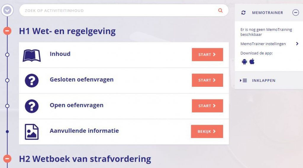 Voor de student zijn er per hoofdstuk veel oefenvragen beschikbaar waarop direct het juiste antwoord is te zien. Met de MemoTrainer krijgt de student de oefenvragen met enige regelmaat opnieuw aangeboden zodat hij door de herhaling de lesstof goed kan oefenen. Aan het einde van de module kan de student meerdere zelftoetsen maken en hiermee oefenen voor het examen. De e-learning is ook via de gratis app beschikbaar.